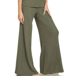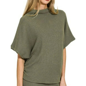 This stylish two-piece knit sweater set features a relaxed oversized short-sleeve top paired with high-waisted wide-leg pants. Made from soft ribbed knit material in a versatile olive green shade, this coordinated set offers ultimate comfort and effortless style. The loose-fitting top provides a casual, laid-back look while the flowing wide-leg pants create an elegant silhouette. Perfect for lounging, casual outings, or creating a chic athleisure look. The breathable knit fabric ensures all-day comfort while the matching design creates a put-together appearance with minimal effort.