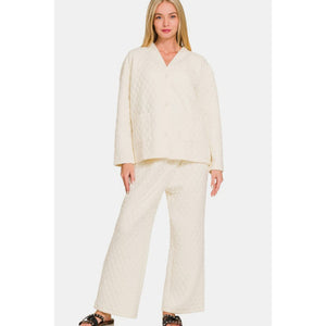 Zenana Quilted Button Up Long Sleeve Top and Pants Lounge Set