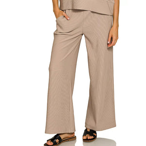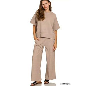 This comfortable and stylish set includes a ribbed round neck tee and matching pants. Perfect for lounging at home or running errands in style. The ribbed texture adds a trendy touch to this classic silhouette. Made from soft and breathable fabric for all-day comfort. Elevate your casual wardrobe with this must-have set.