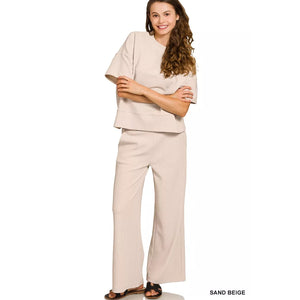 This comfortable and stylish set includes a ribbed round neck tee and matching pants. Perfect for lounging at home or running errands in style. The ribbed texture adds a trendy touch to this classic silhouette. Made from soft and breathable fabric for all-day comfort. Elevate your casual wardrobe with this must-have set.