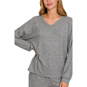 This premium loungewear set features a soft heathered knit construction that delivers exceptional comfort and breathability. The V-neck long sleeve top offers a flattering silhouette with its relaxed fit, while the coordinating wide leg pants feature an elastic waistband for maximum comfort. Made from high-quality knit fabric blend, this set provides the perfect balance of style and comfort for home relaxation, casual outings, or sleepwear. The versatile grey heather colorway ensures easy styling and timeless appeal. This two-piece set is designed for women who value both comfort and style in their casual wardrobe.