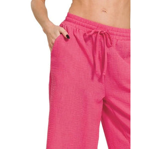 These stylish wide leg pants feature a comfortable elastic waistband with drawstring closure, crafted from soft textured fabric that provides excellent breathability and comfort. The relaxed fit and cropped ankle length make them perfect for casual wear, yoga, or lounging at home. The vibrant pink color adds a pop of style while the lightweight material ensures all-day comfort. With practical side pockets and easy-care machine washable fabric, these pants combine fashion with functionality for the modern lifestyle.