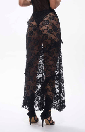 A Transparent Floral Decor Long Skirt is a sheer black lace piece with delicate floral accents. Perfect for elegant events, this high-quality skirt offers a perfect match for a romantic look. This floor-length skirt features intricate floral decorations delicately woven into the fabric, adding a romantic and feminine touch to its transparent design. The lightweight lace drapes beautifully, creating a flowing silhouette that’s ideal for elegant occasions like garden parties, weddings, or formal evening events. Made with high-quality materials, this skirt ensures a perfect match when paired with a chic bodysuit or top, offering a sophisticated, dreamy look that captivates effortlessly.