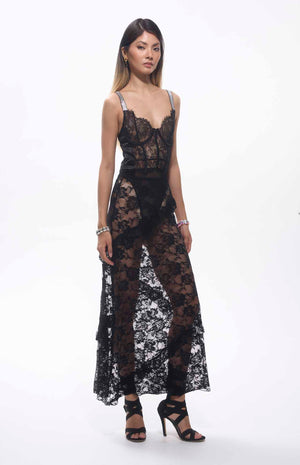 Sheer black lace, floor-length, intricate floral decorations, lightweight and flowing silhouette, high-quality, perfect match for elegant occasions like garden parties, weddings, or formal evening events.