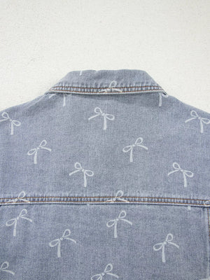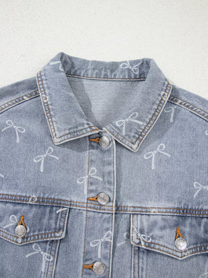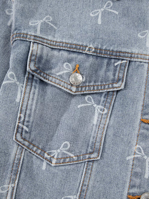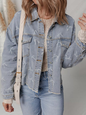 Bow Knot Print Light Wash Raw Hem Denim Jacket