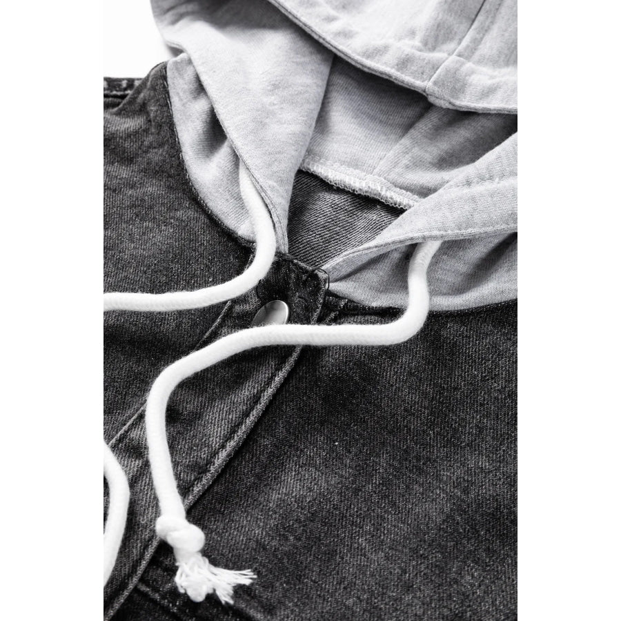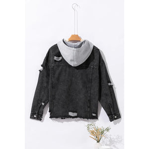 Distressed Drawstring Long Sleeve Hooded Denim Jacket