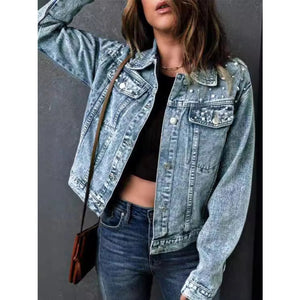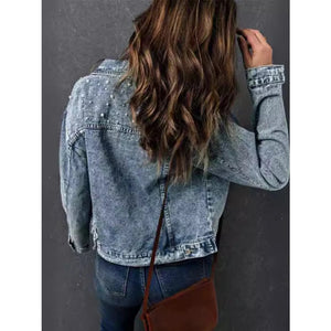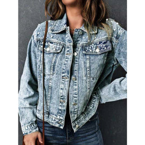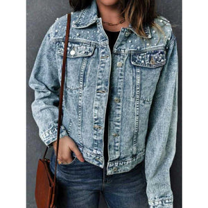Full Size Pearl Detail Button Up Long Sleeve Denim Jacket Plus Size