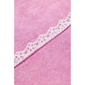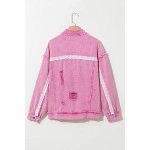 Lace Detail Distressed Raw Hem Long Sleeve Denim Jacket