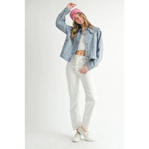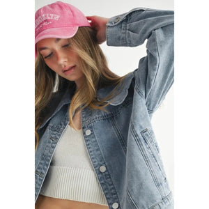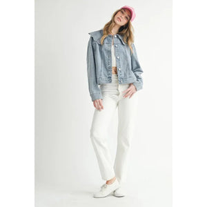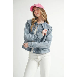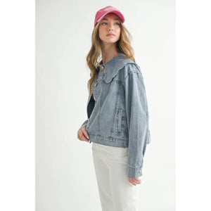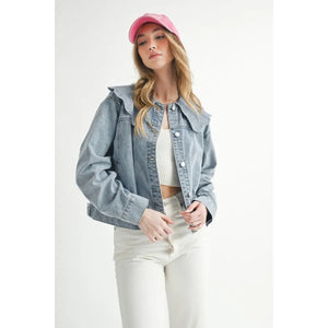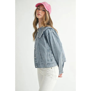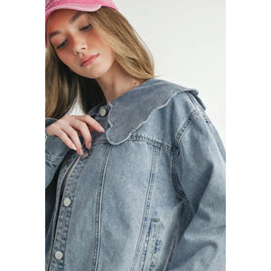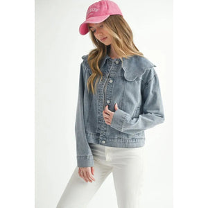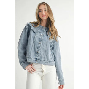 The Scallop Peter Pan Collar Denim Jacket is a charming and elegant addition to your wardrobe. The scallop detailing and Peter Pan collar add a touch of sweetness and femininity to this classic denim jacket. Pair it with a dress or jeans for a chic and stylish look.