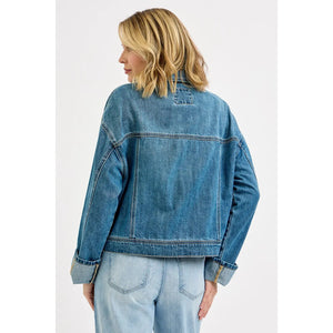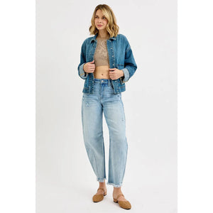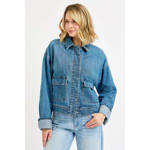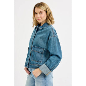 RISEN Oversized Cargo Pocket Denim Jacket with Cuffed Sleeves