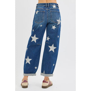 RISEN Mid Rise Ankle Length Relaxed Barrel Star Printed Jeans