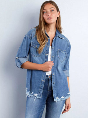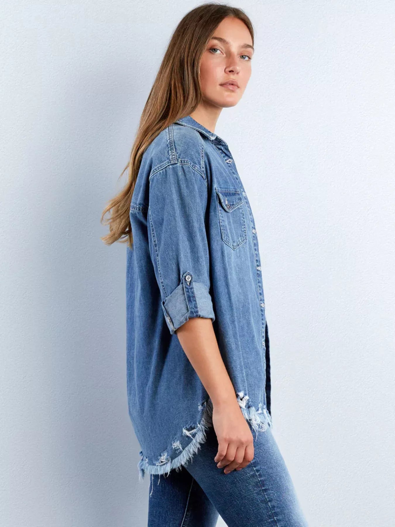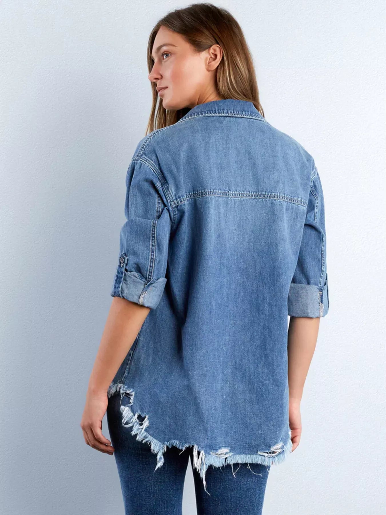 Frayed Hem Roll-Up Sleeve Denim Shirt
