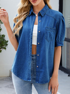 Puff Sleeve Button-Down Denim Shirt