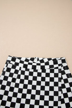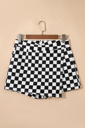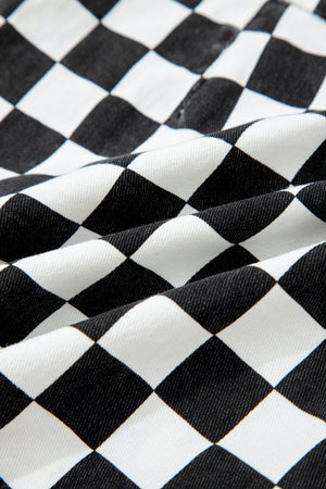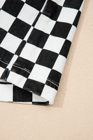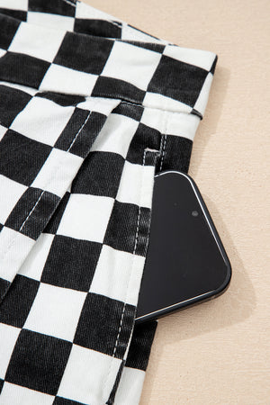 Black Checkered Print Overlap Denim Shorts