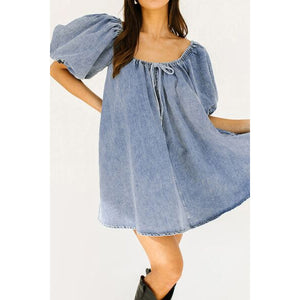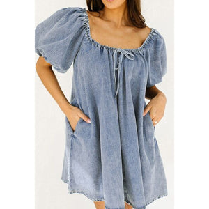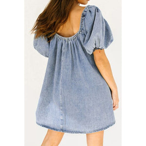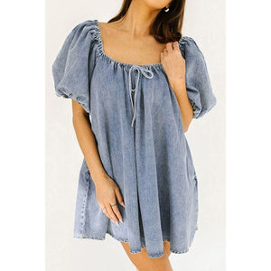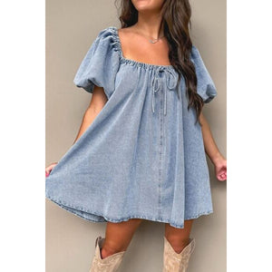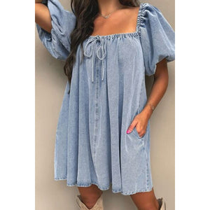 Bubble Sleeve Square Neck Denim Babydoll Dress
