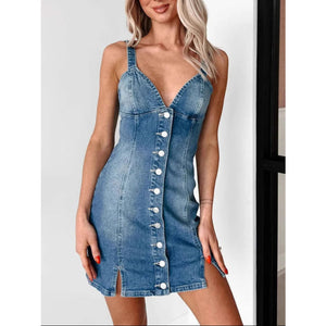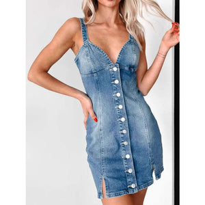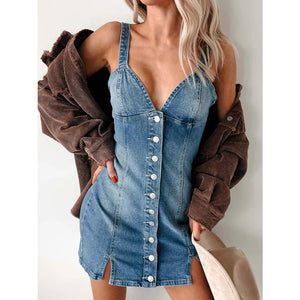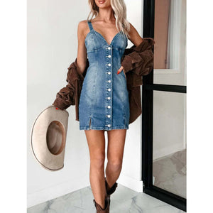 Button Front Sweetheart Neck Denim Mini Dress