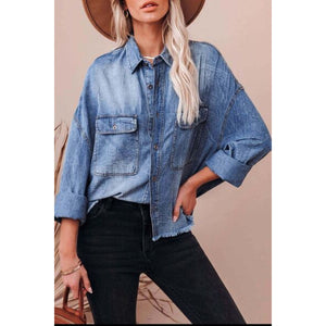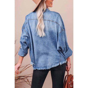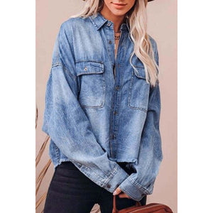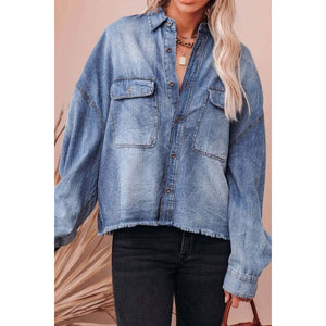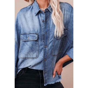 Collared Neck Raw Hem Long Sleeve Denim Shirt