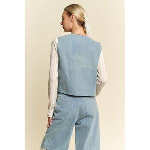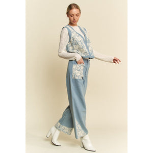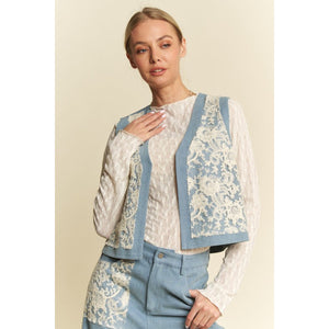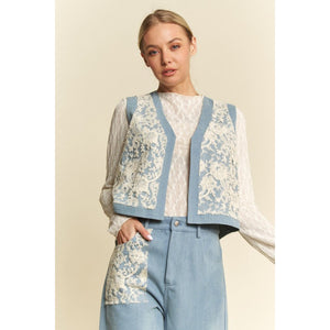 The Lace Patch Open Front Denim Vest is a trendy and stylish garment featuring lace accents for a feminine touch. The open front design adds a modern and versatile element to the vest. Made from denim material, this vest offers a casual yet chic look that can be dressed up or down. Perfect for layering over tops and dresses, the denim vest with lace patch detailing adds a fashionable twist to any outfit.