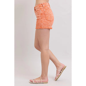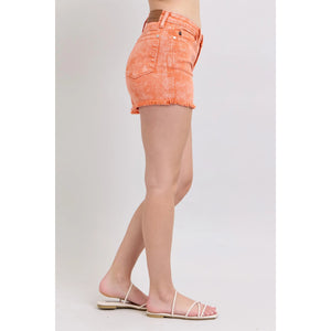 These stylish coral acid wash denim shorts feature a fashion tie-dye inspired pattern that creates a unique vintage aesthetic. Crafted from comfortable stretch denim fabric, they offer both style and comfort with their relaxed fit design. The raw frayed hem adds a casual, edgy touch while the classic five-pocket styling maintains functionality. The vibrant coral orange color with subtle wash variations makes these shorts a standout piece for summer wardrobes. The mid-rise waist provides a flattering fit, secured with a traditional button and zip closure.