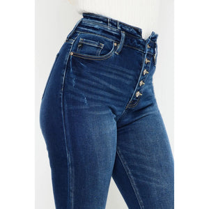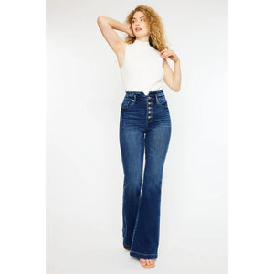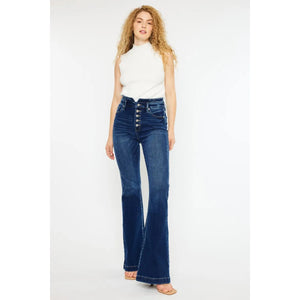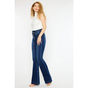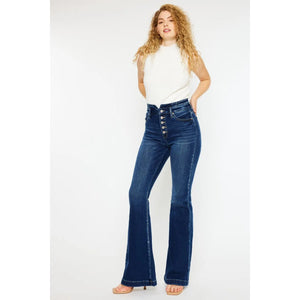 Make a retro statement with these button fly high rise flare jeans. The button fly detail adds a vintage touch to the classic flare jeans silhouette. The high rise design offers a flattering fit that cinches at the waist and elongates the legs. Perfect for a boho-inspired look, pair these flare jeans with a flowy blouse and platform sandals for a stylish and on-trend ensemble.