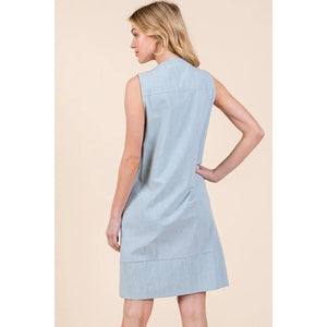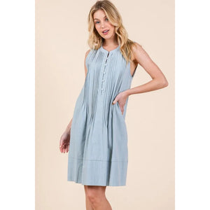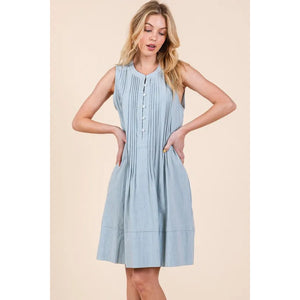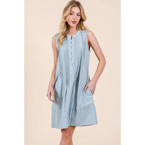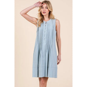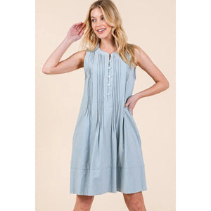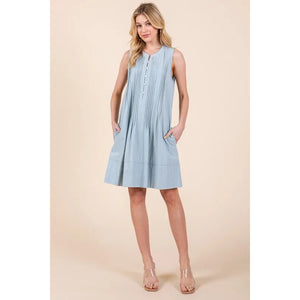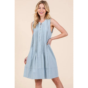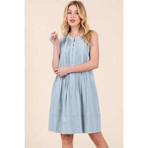 The Denim Pintuck Detail Sleeveless Midi Dress features a classic denim fabric with pintuck detailing for a stylish touch. This dress offers a timeless and versatile look that can be dressed up or down for various occasions. With its sleeveless design and midi length, it is a chic and comfortable option for your wardrobe.