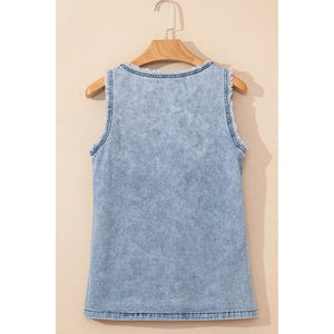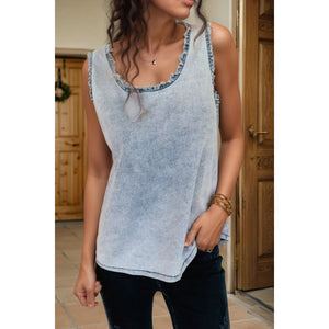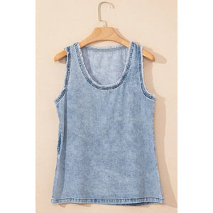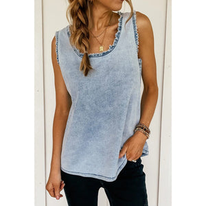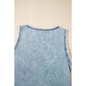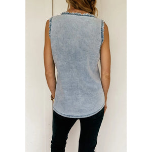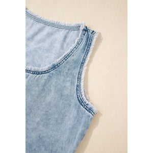 Mineral Wash Denim Frayed U Neck Sleeveless Top