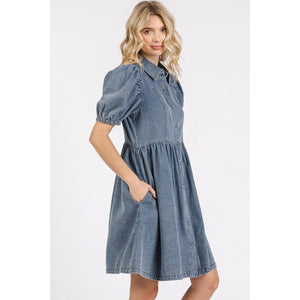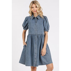 The Button Down Puff Sleeve Denim Dress is a fashionable and versatile piece that combines the classic look of denim with trendy puff sleeves and a button-down front. This dress offers a blend of casual and chic style, making it suitable for a variety of occasions. The puff sleeves add a touch of drama and femininity, while the button-down design allows for easy wear and a flattering fit.