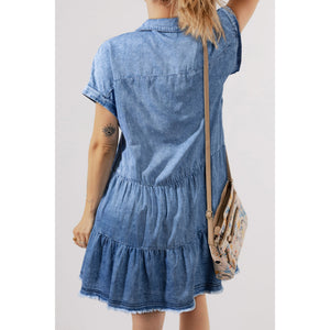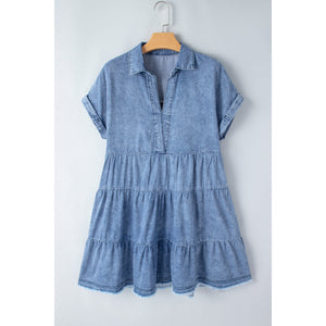 Raw Hem Collared Neck Short Sleeve Denim Dress