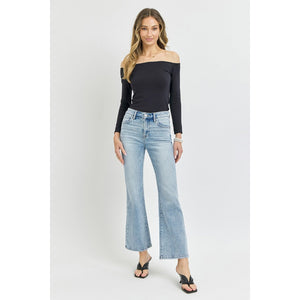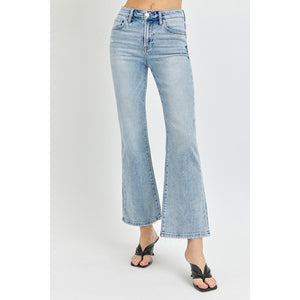 High Rise Ankle Flare Jeans combine a trendy high-waisted fit with a stylish flared hem, giving a nod to vintage fashion. The high rise enhances your waistline, while the flare from the knee adds a touch of retro flair. These jeans offer a balanced silhouette that’s both flattering and comfortable. The cropped length keeps the look fresh and modern, making them perfect for showcasing your favorite footwear. Versatile enough for both casual and dressy outfits, they add a fashionable twist to any wardrobe. Ideal for a chic, confident look.