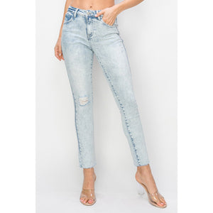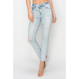 These high rise distressed skinny jeans feature a figure-flattering silhouette and on-trend distressed details. The high rise design adds a modern touch to the classic skinny fit. The distressed areas give these jeans a cool, laid-back vibe perfect for casual outfits. With a versatile style, they can be dressed up or down for various occasions. Made for comfort and style, these jeans are a wardrobe staple for a chic and effortless look. Whether paired with sneakers for a casual day out or heels for a night out, these jeans offer endless styling possibilities.