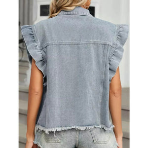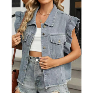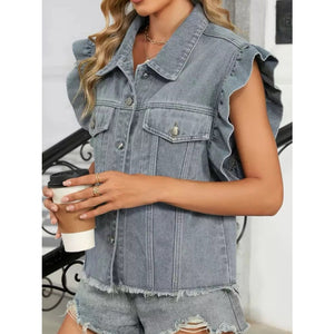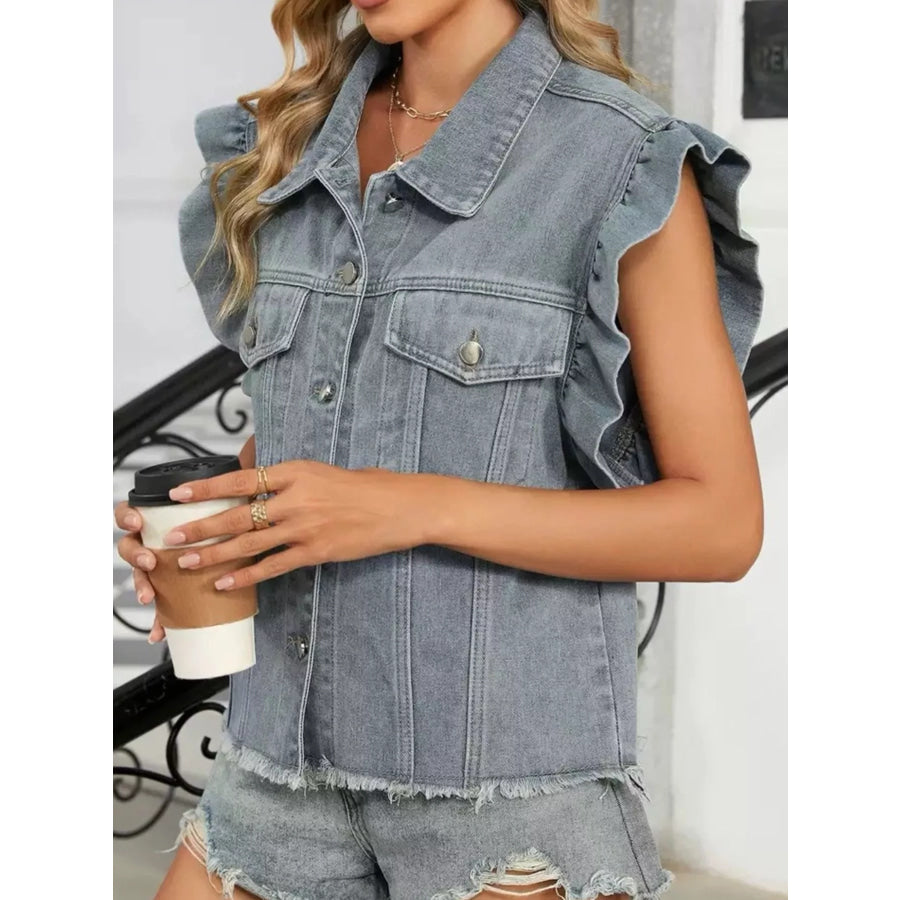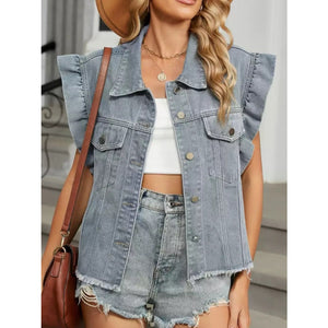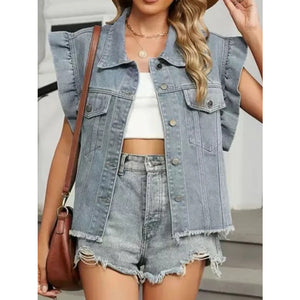 Ruffled Raw Hem Button Up Denim Jacket