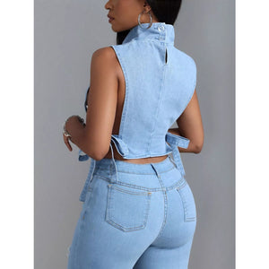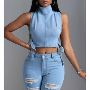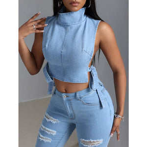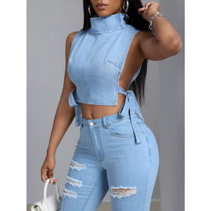 Sleeveless Cropped Denim Turtleneck Top with Side Tie Details