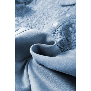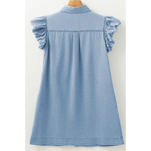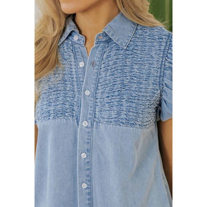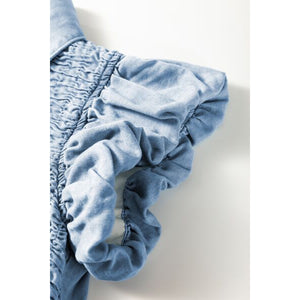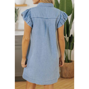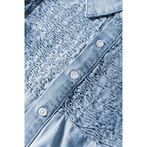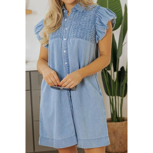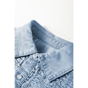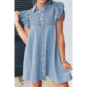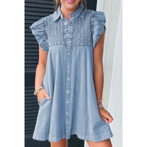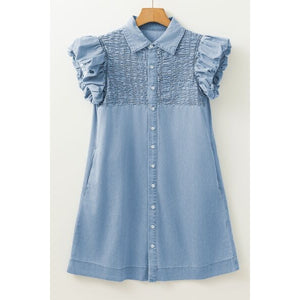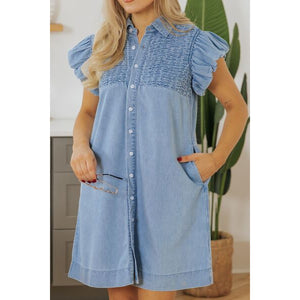 Smocked Collared Neck Cap Sleeve Denim Dress