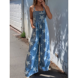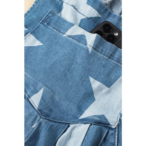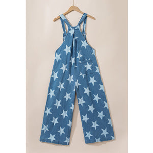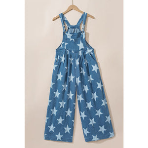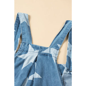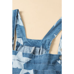 Star Print Buttoned Strap Wide Leg Denim Overalls