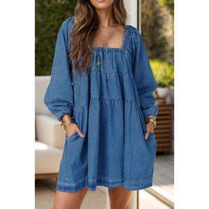 Tied Square Neck Long Sleeve Denim Dress with Pockets