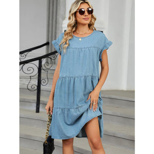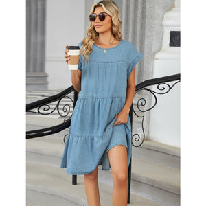 Tiered Round Neck Short Sleeve Denim Dress