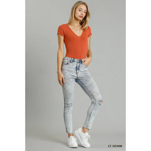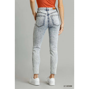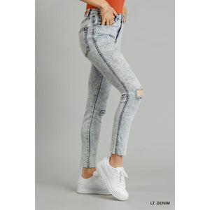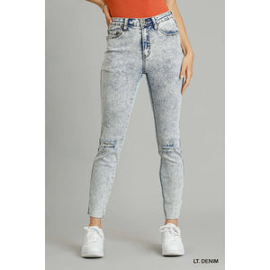 Umgee 5-Pockets Distressed Detail Stretch Denim Skinny Jeans with Unfinished Hem