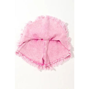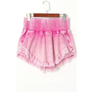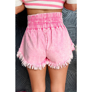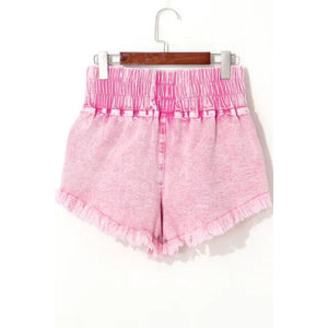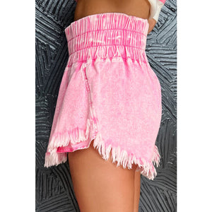 Washed Wide Smocked Waistband Frayed Denim Shorts