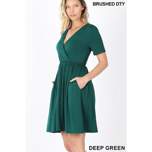 Brushed DTY Buttery Soft Short Sleeve Surplice Dress with Pockets