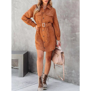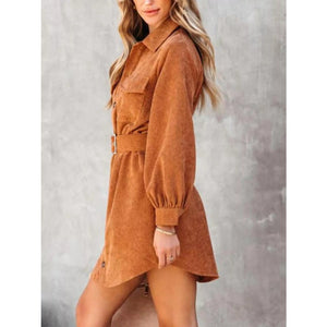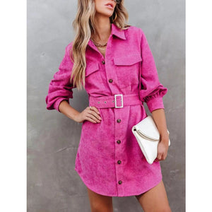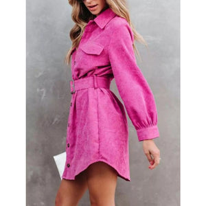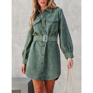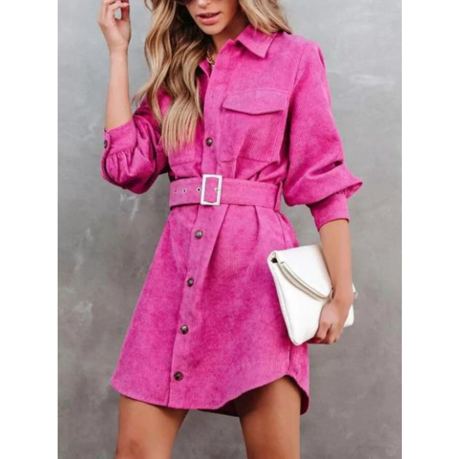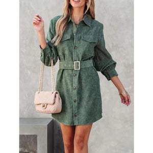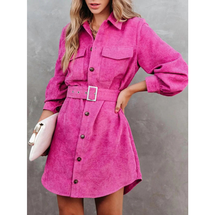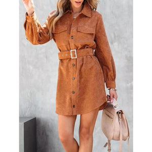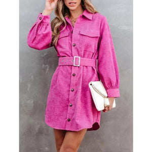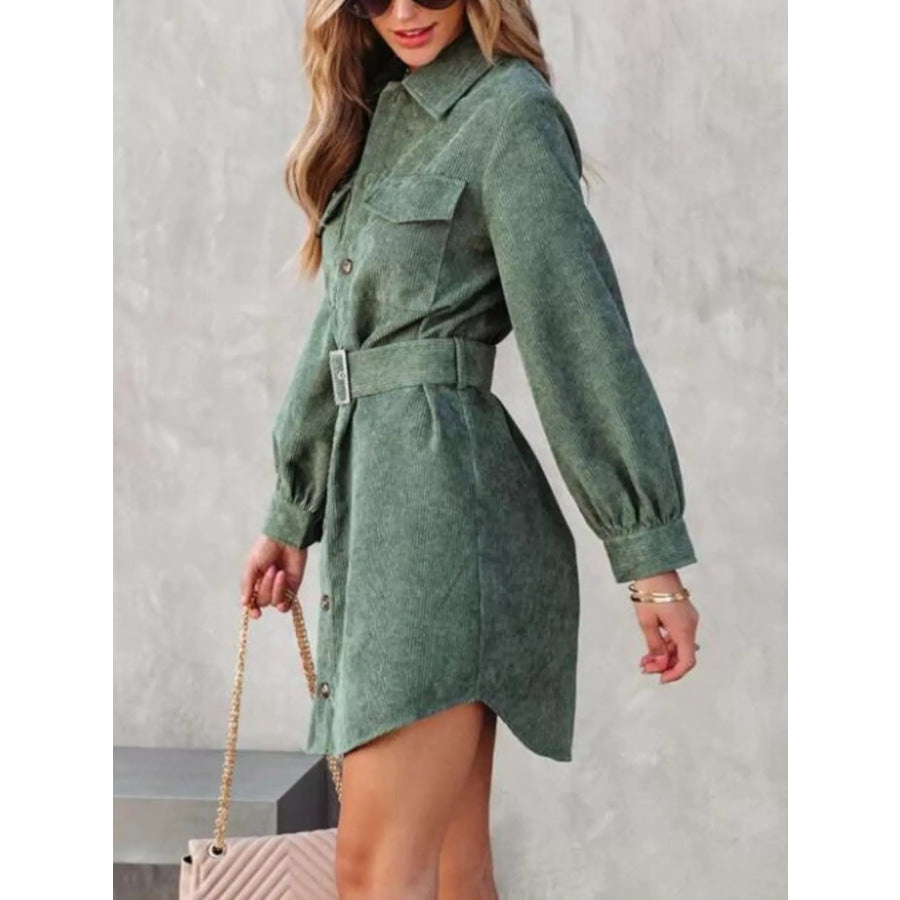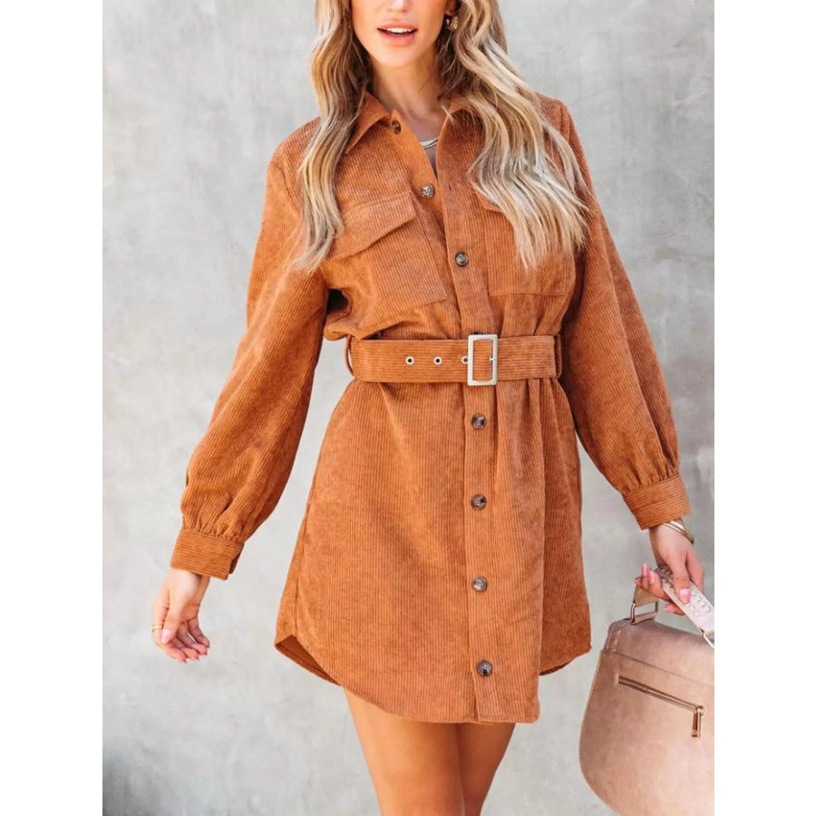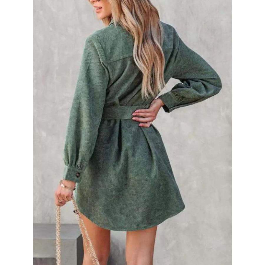 Button Front Belt Long Sleeve Corduroy Dress