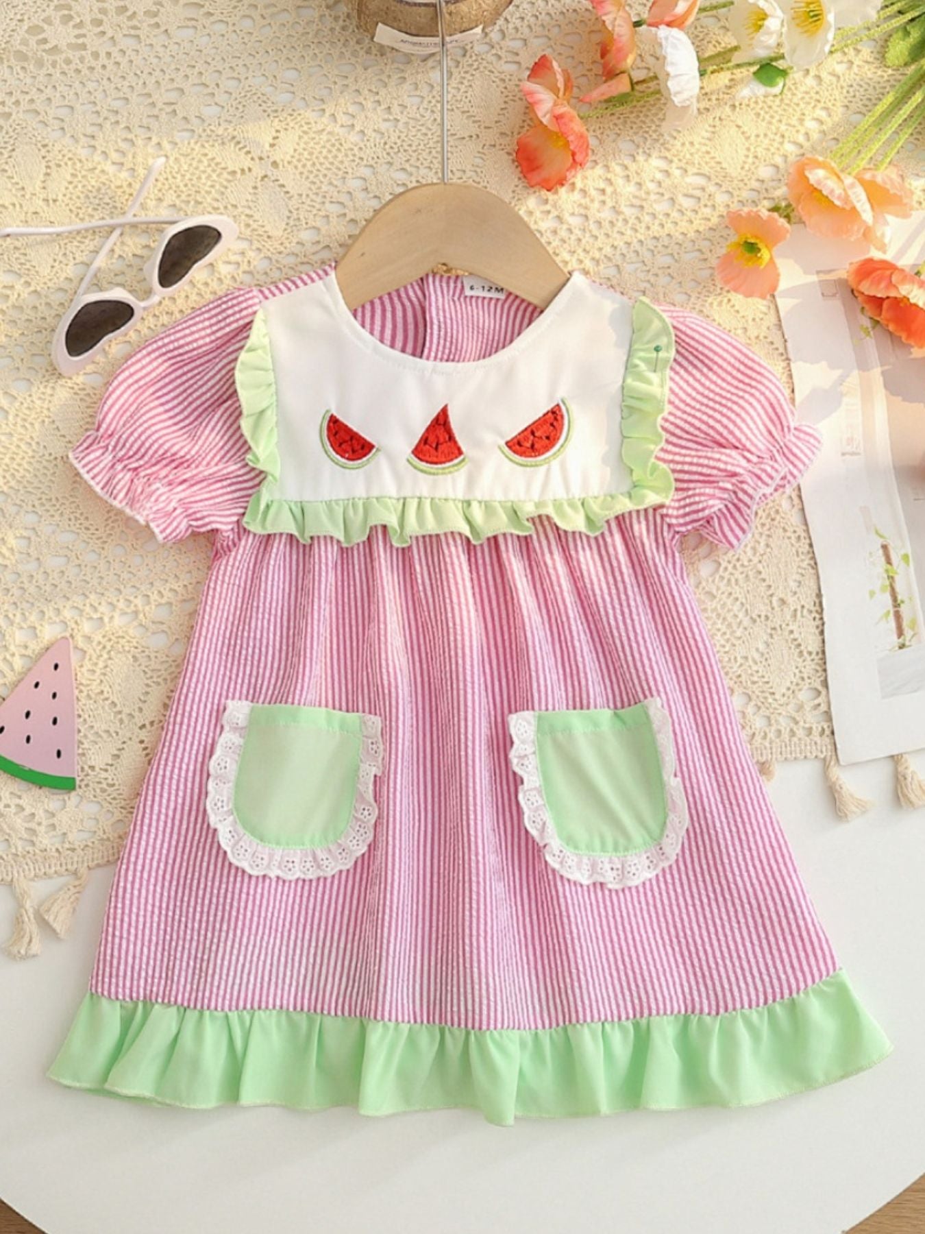 Children's Fruit Embroidered Striped Short Sleeve Dress