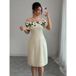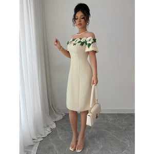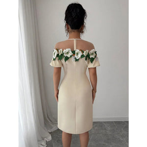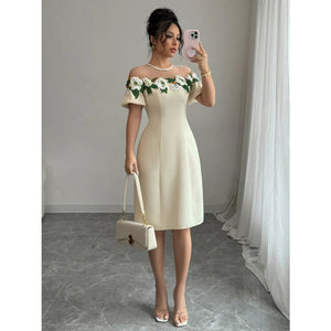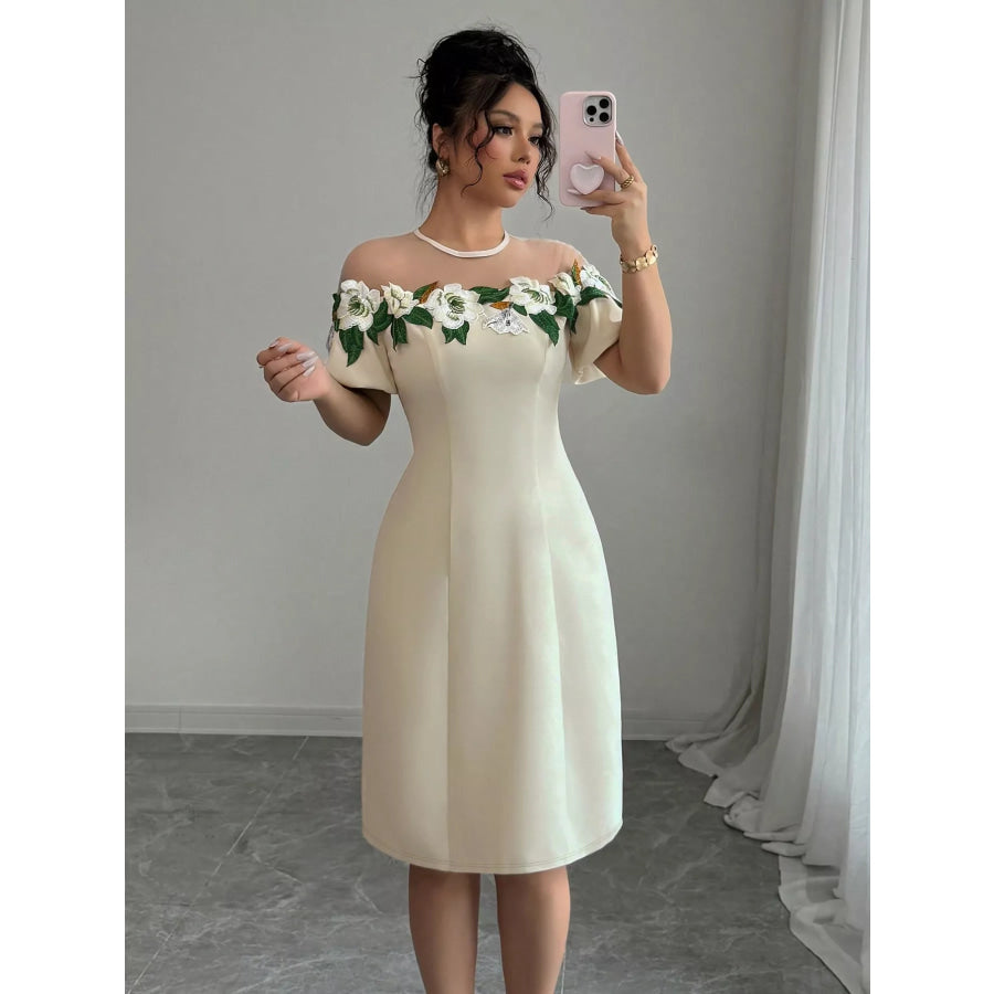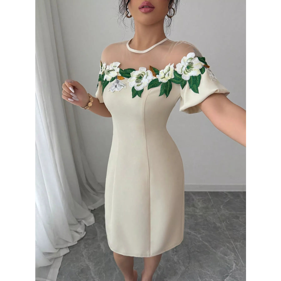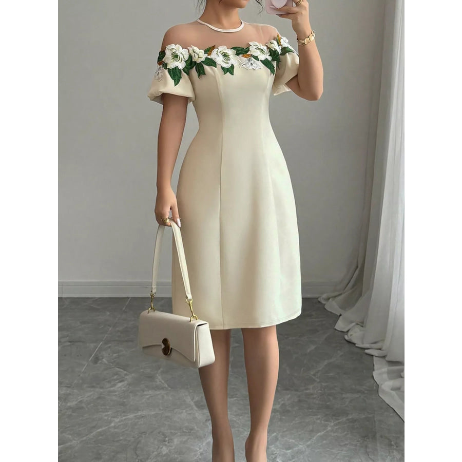 Floral Embroidered Puff Sleeve Dress with Mesh Shoulder