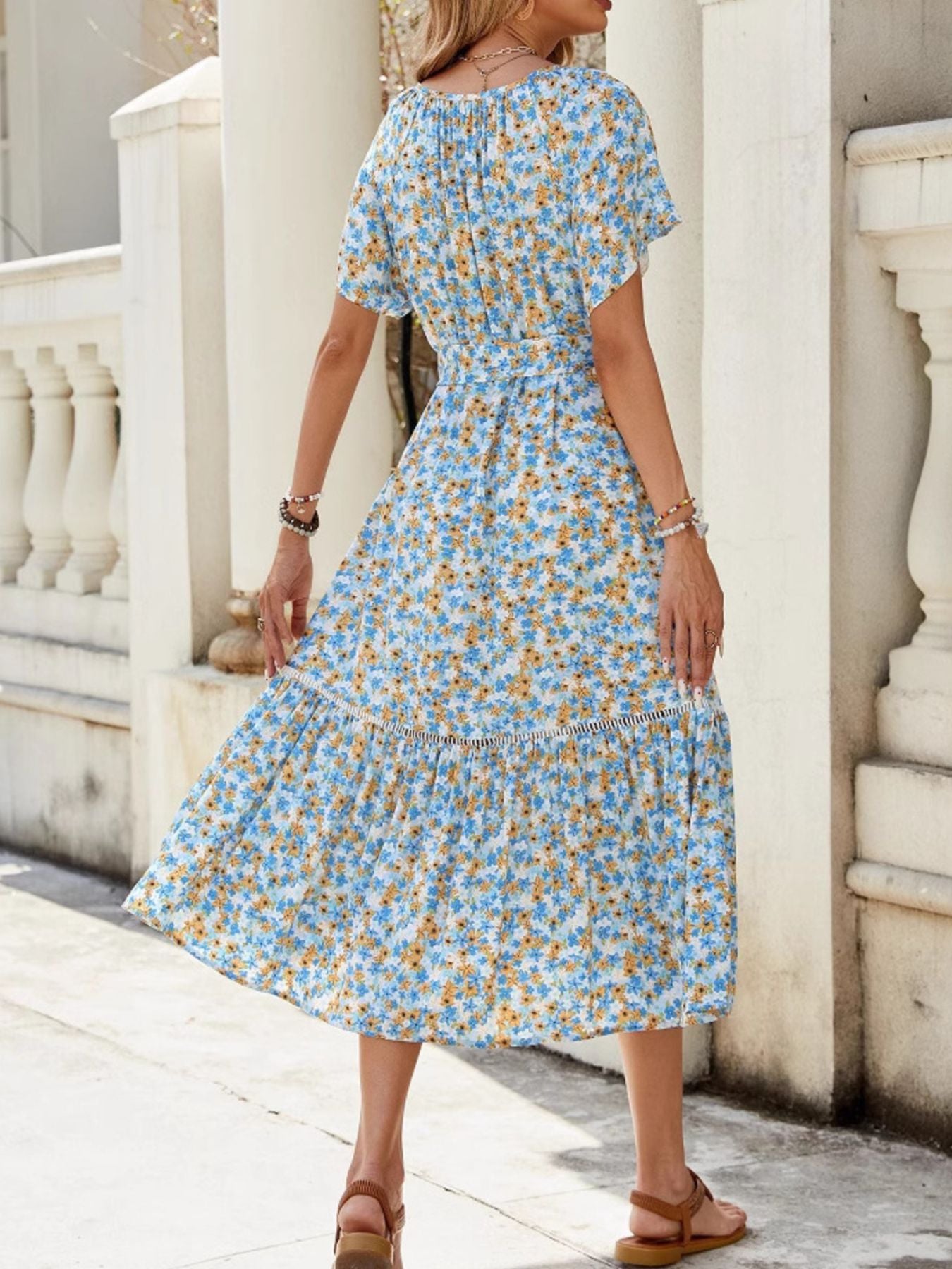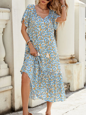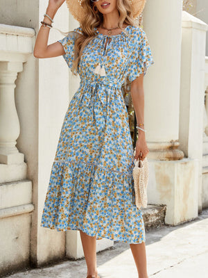 Floral Print Ruffle Hem Tie Front Midi Dress