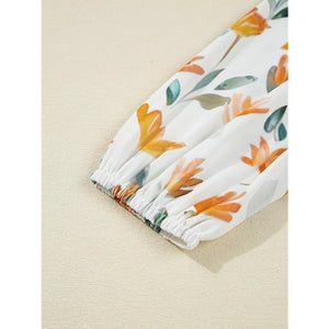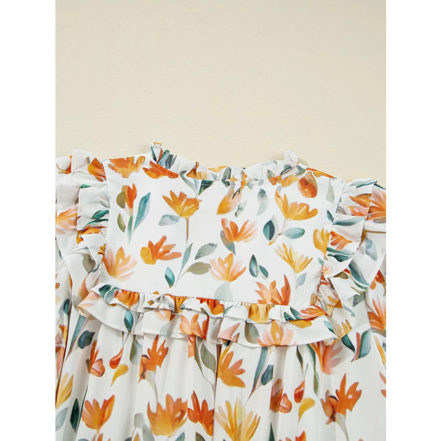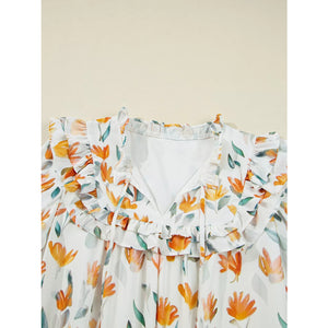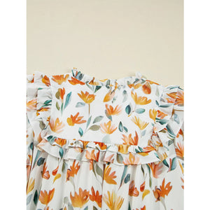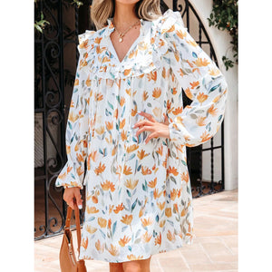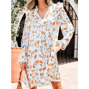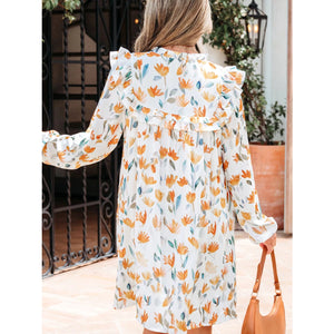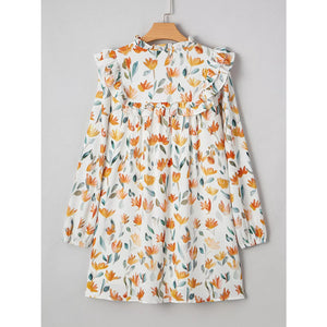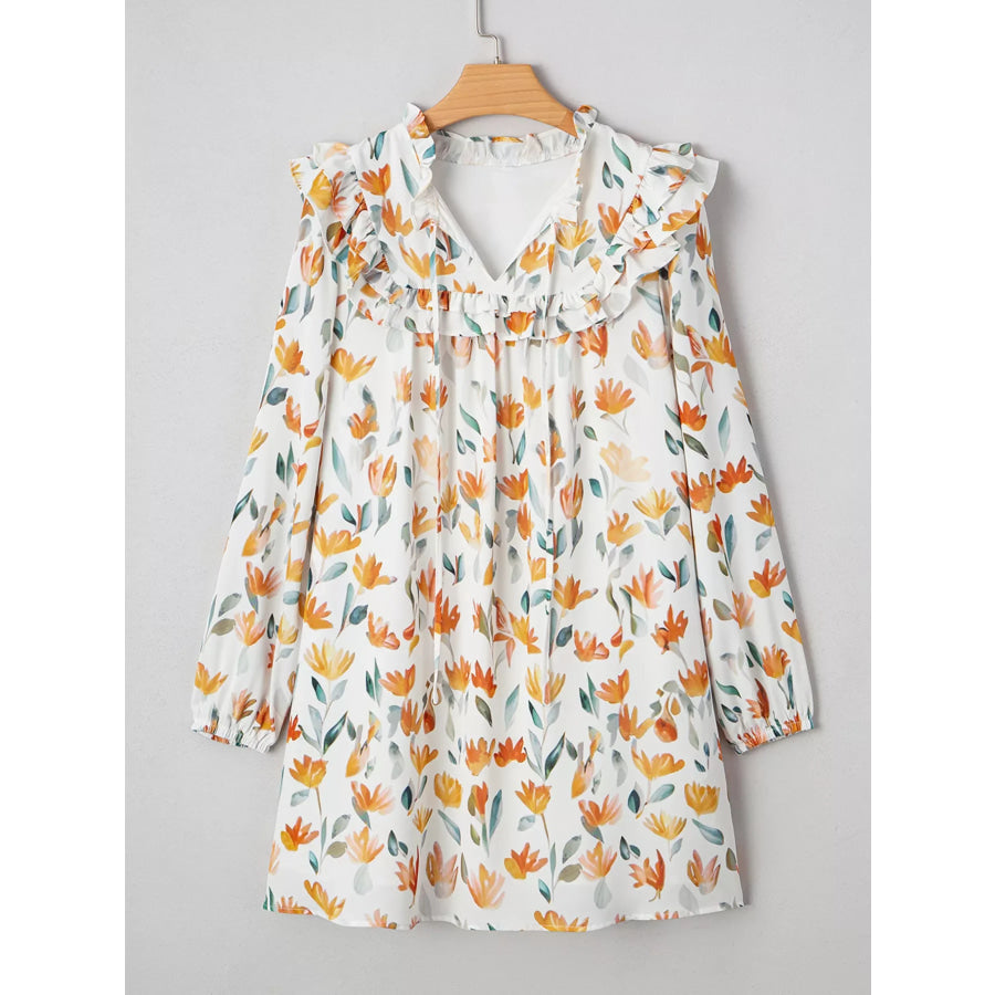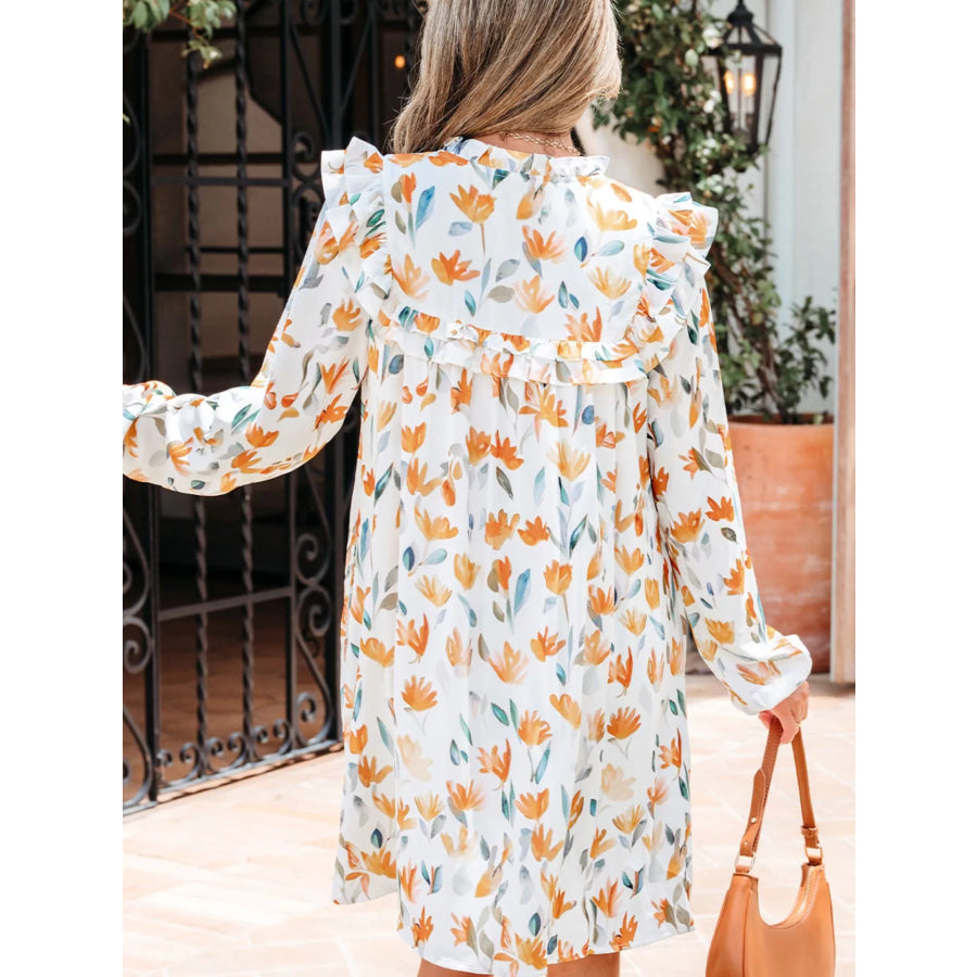 Floral Print Tie Neck Frilled Detail Long Sleeve Mini Dress