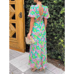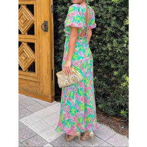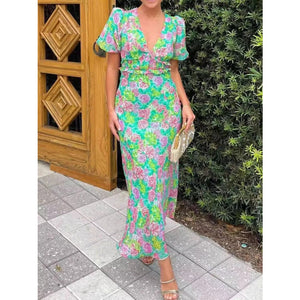 Floral Print V-Neck Puff Sleeve Midi Dress