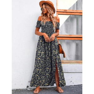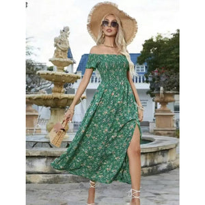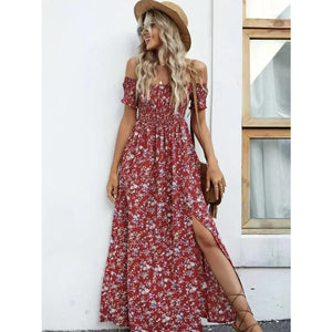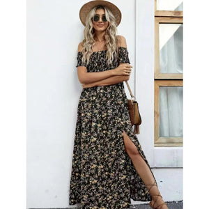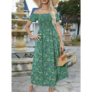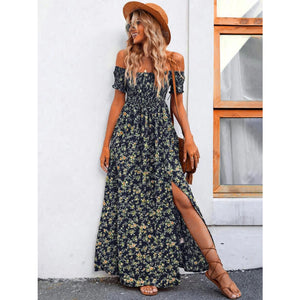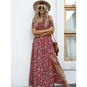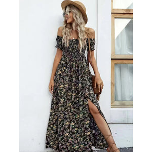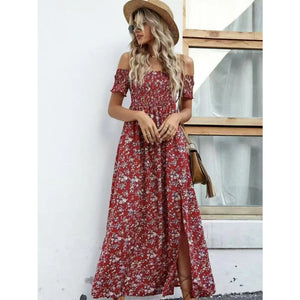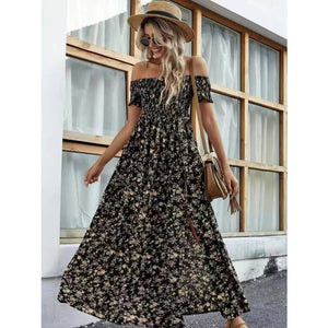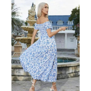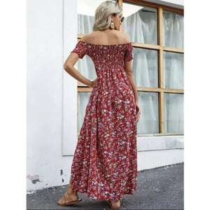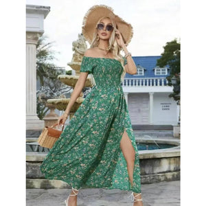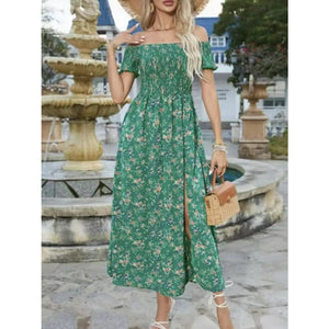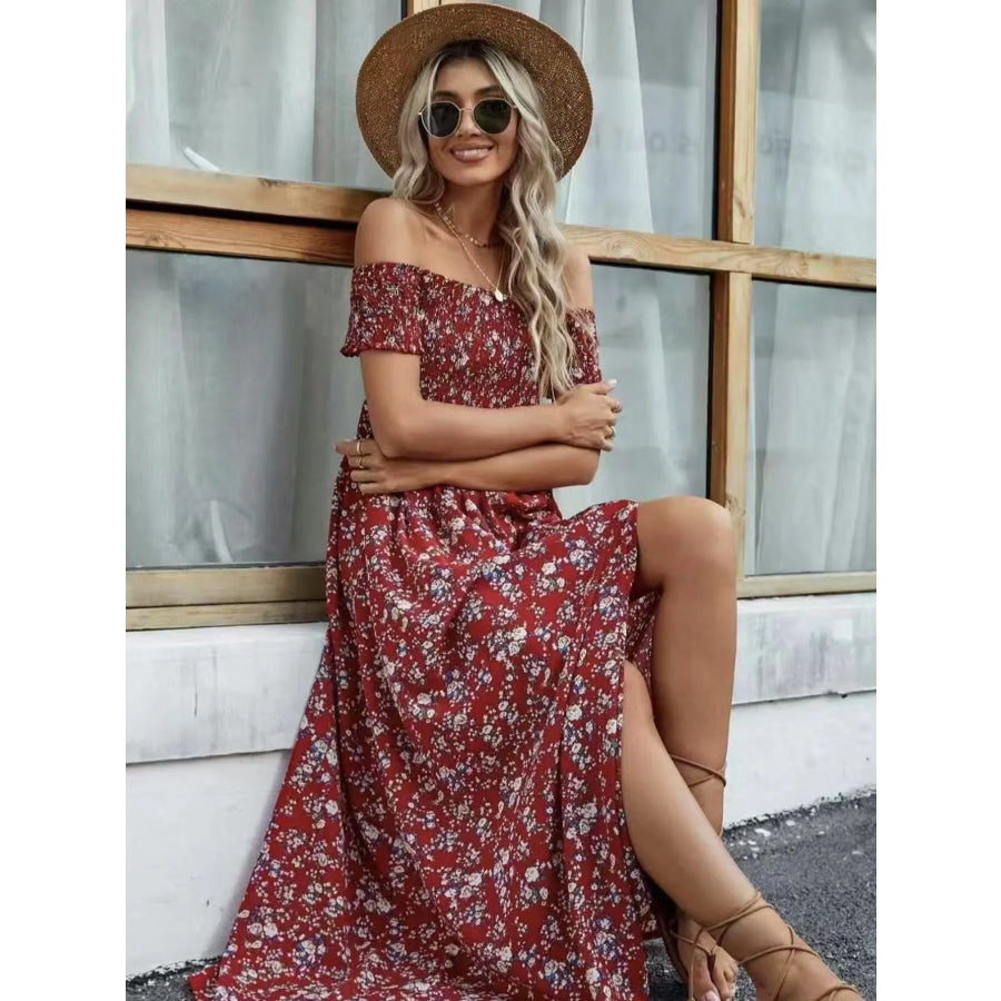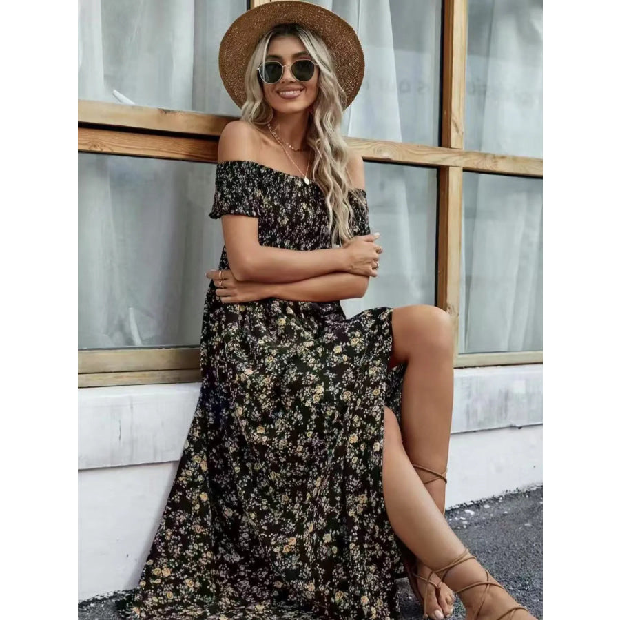 This stunning Full Size Slit Off-Shoulder Floral Midi Dress combines bohemian elegance with modern comfort. Crafted from lightweight, breathable fabric perfect for warm weather, it features an alluring off-shoulder neckline with elastic band for secure fit. The delicate floral print adds feminine charm while the strategic side slit provides both style and movement. The midi length offers versatility for various occasions, from casual beach days to summer parties. Designed with plus size inclusivity in mind, this dress flatters all body types with its flowy A-line silhouette. The pull-on design ensures effortless dressing, making it a perfect choice for vacation wear, date nights, or casual outings.