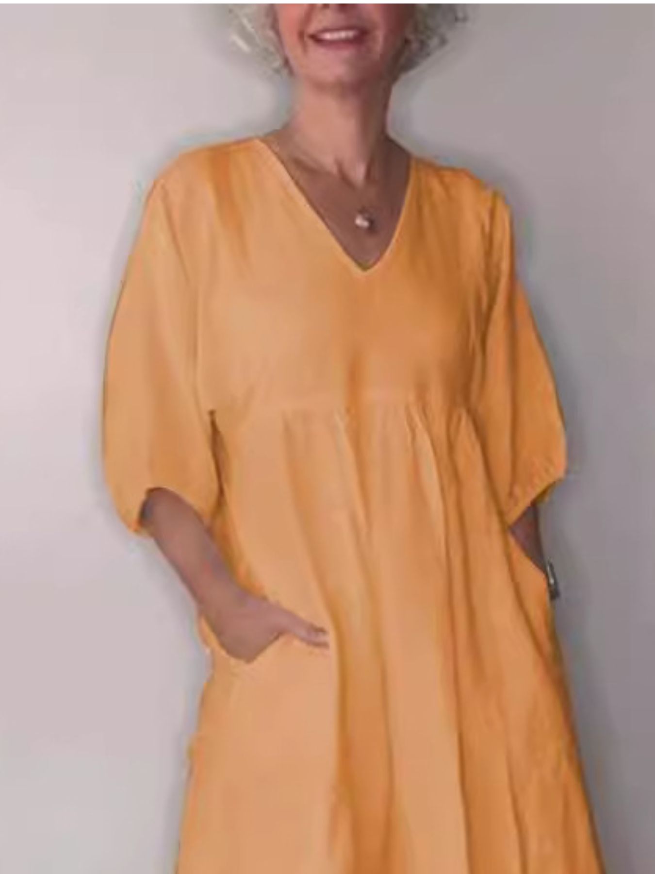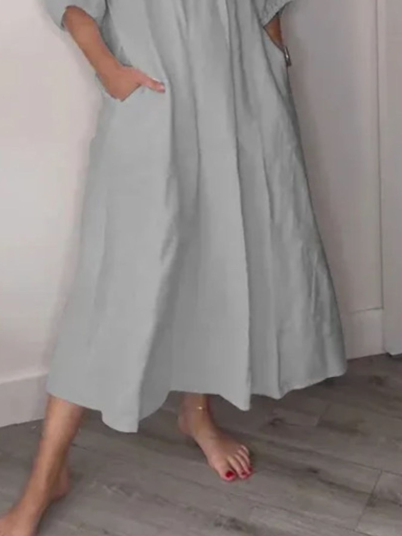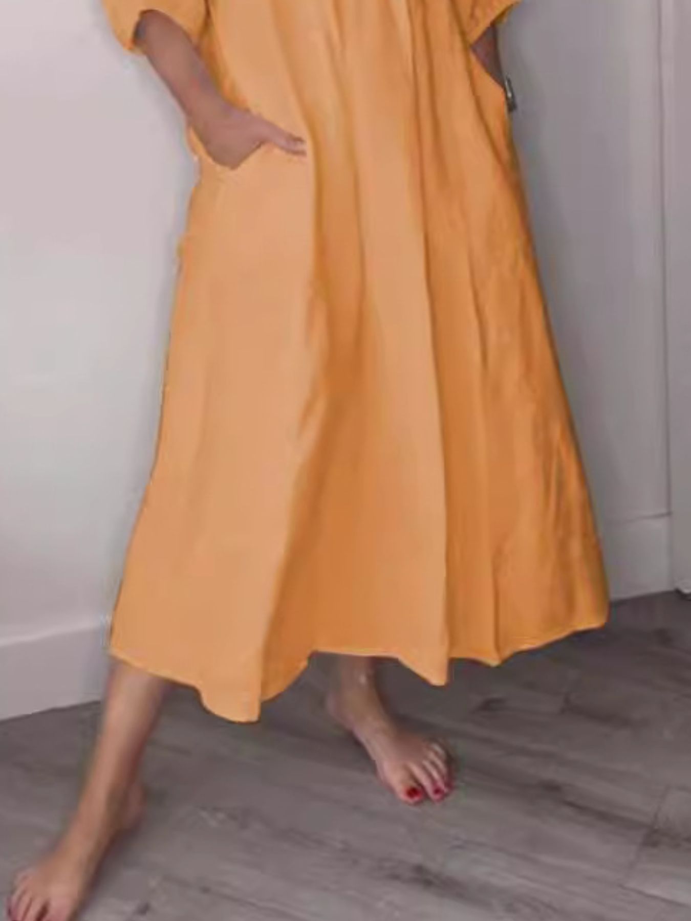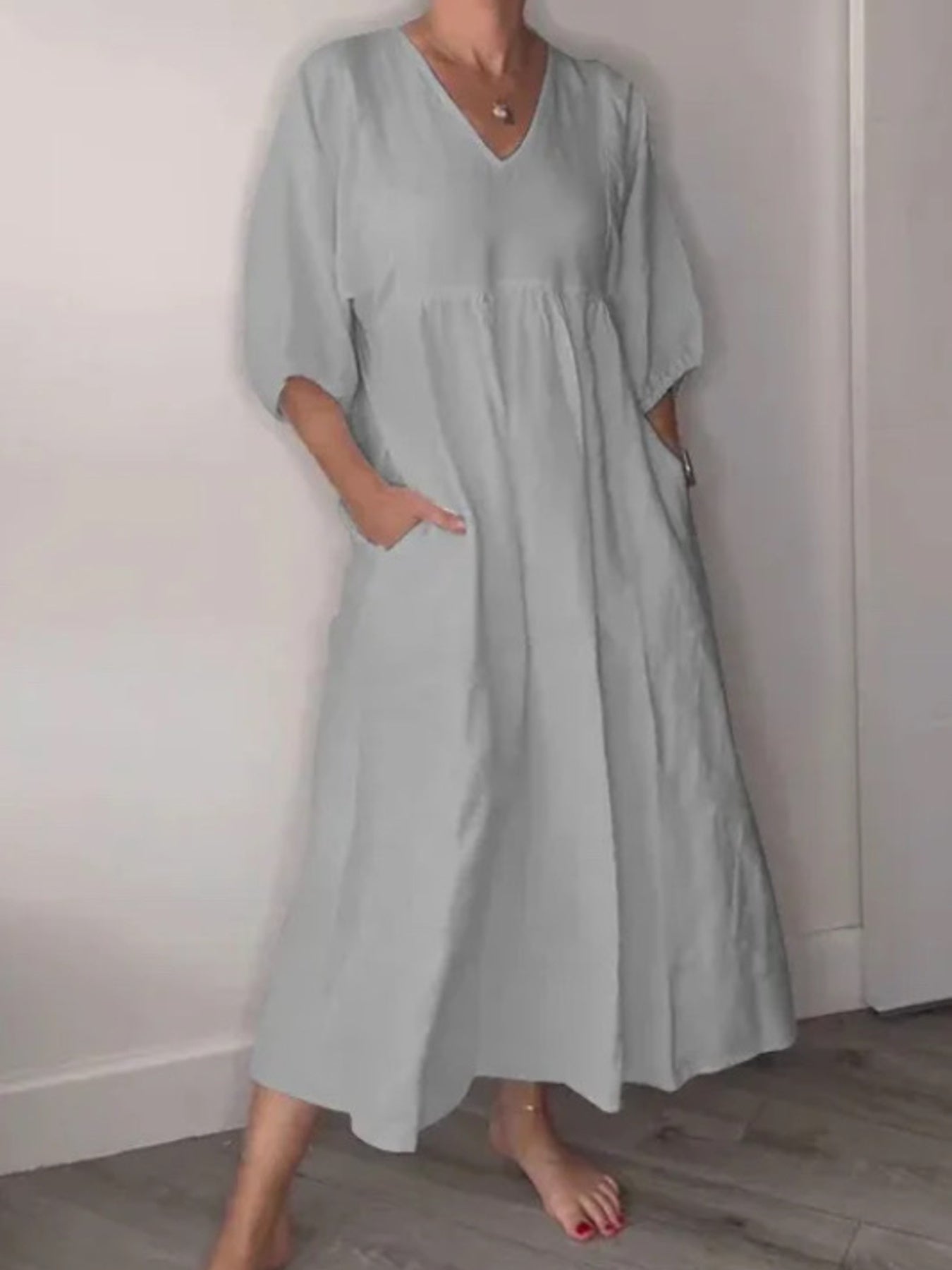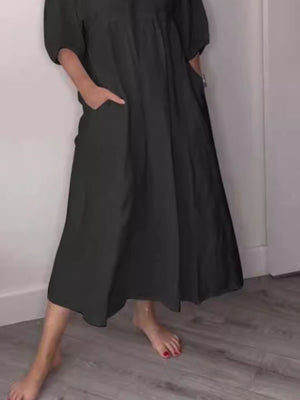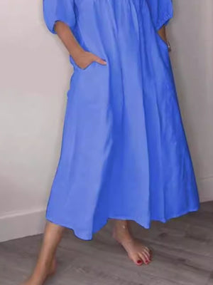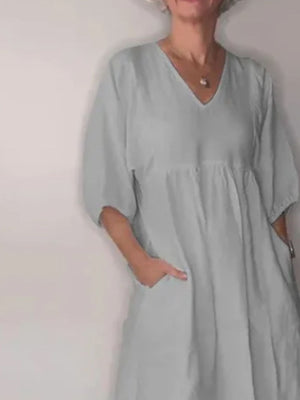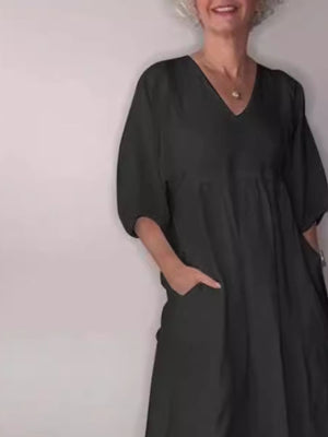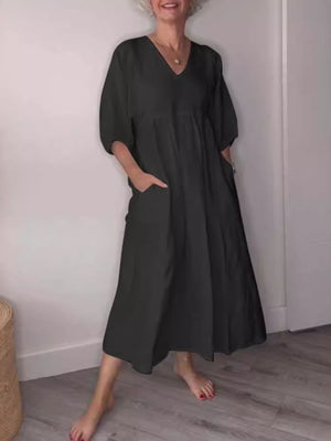 Full Size V-Neck Loose Fit Midi Dress with Pockets Plus Size