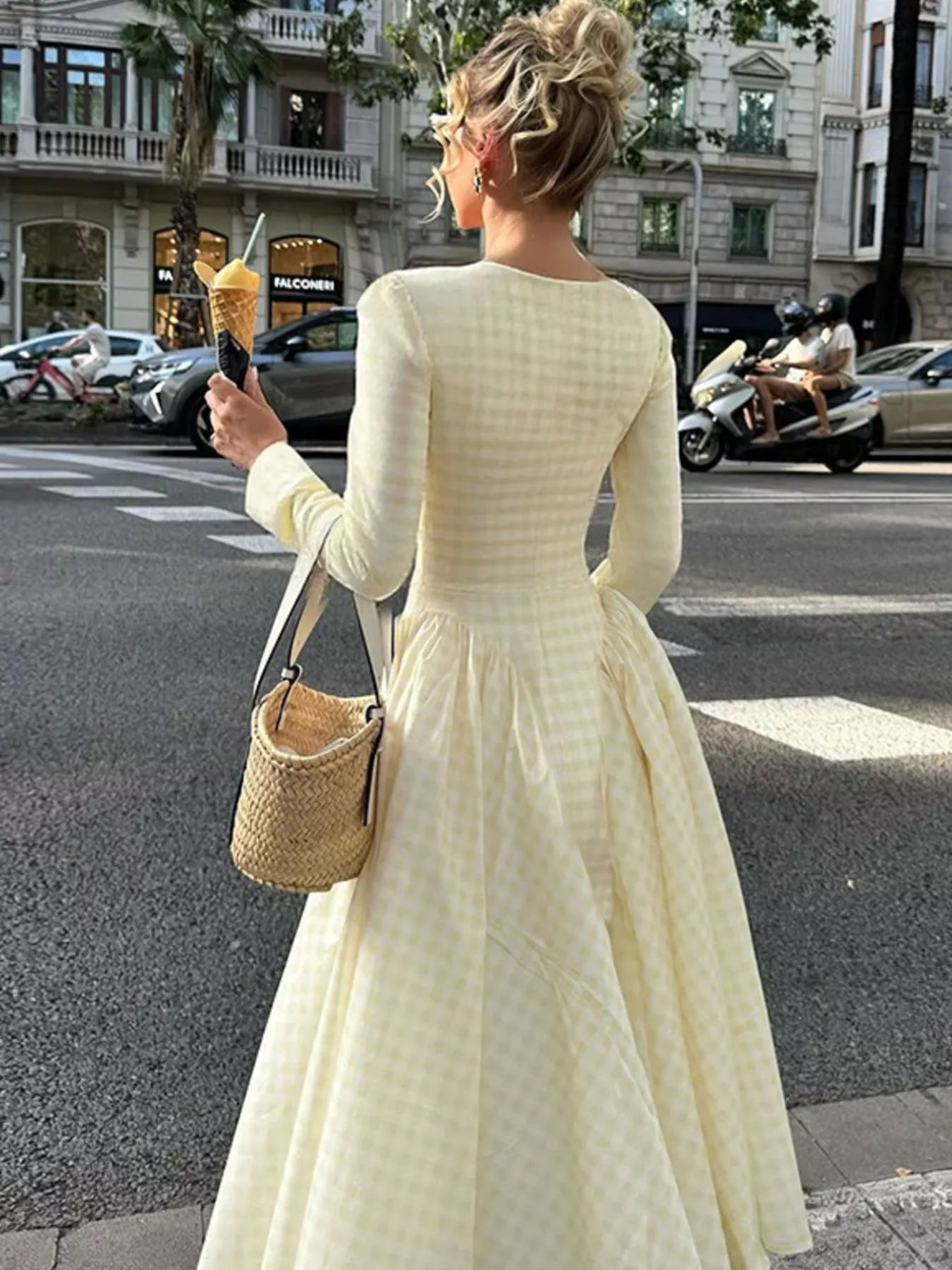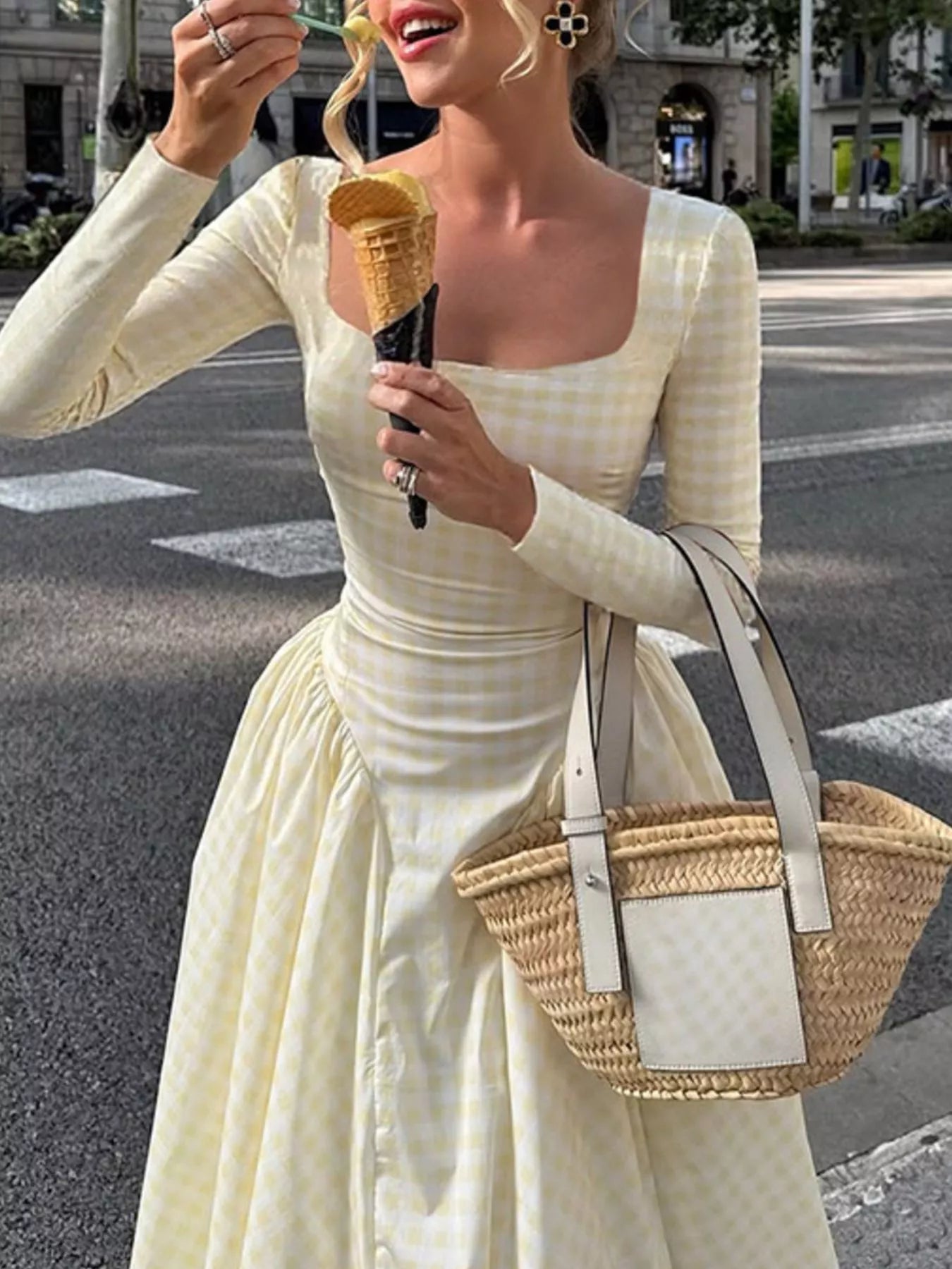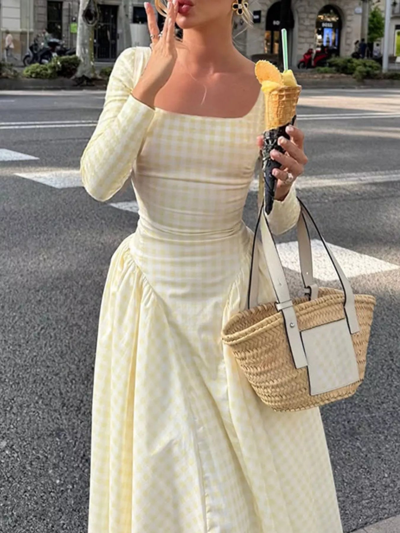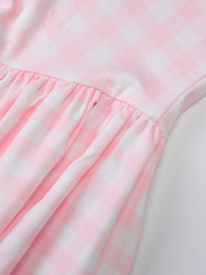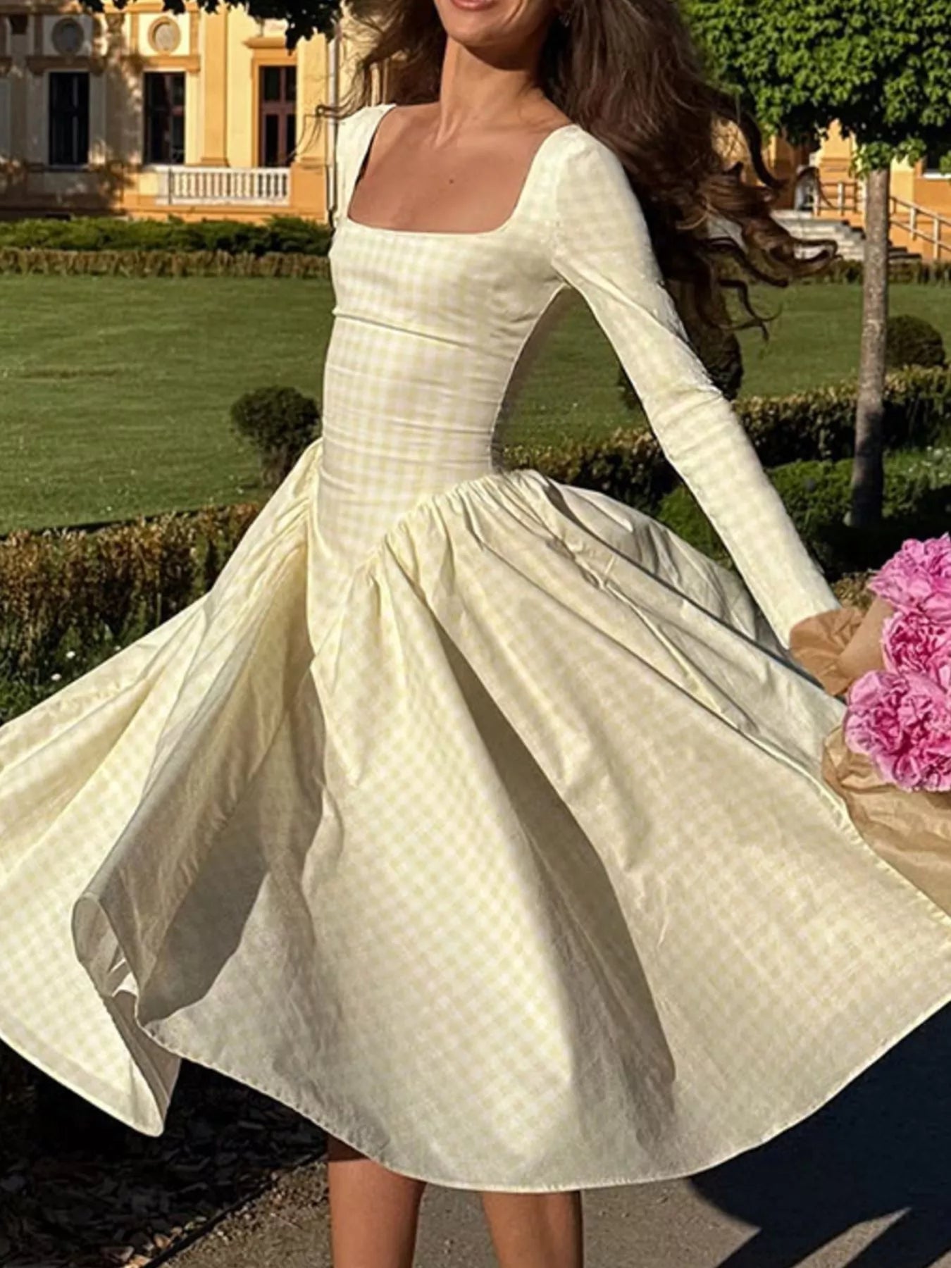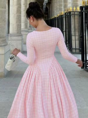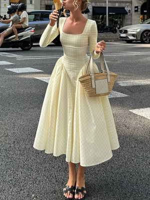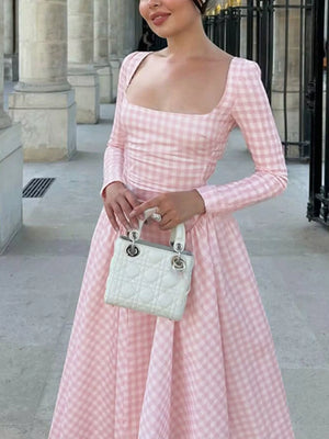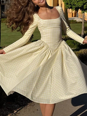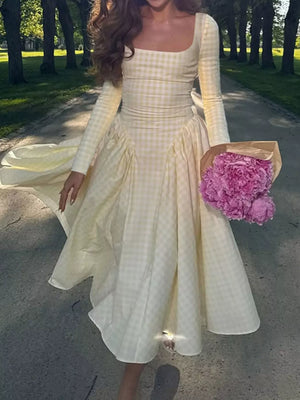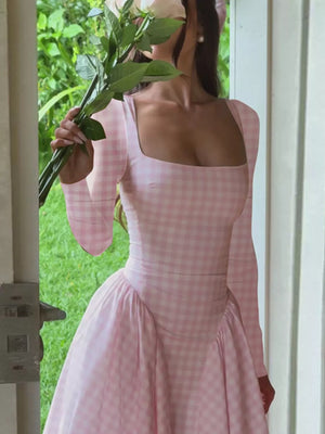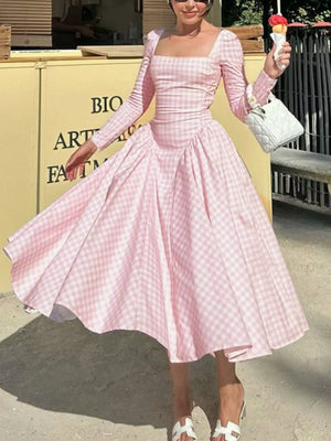 Gingham Square Neck Long Sleeve Gathered Midi Dress