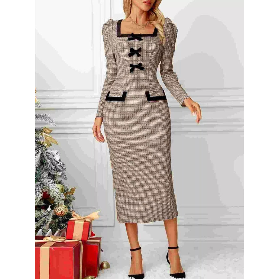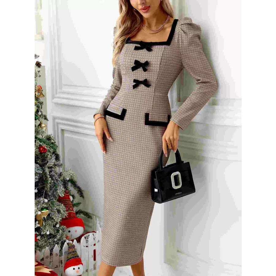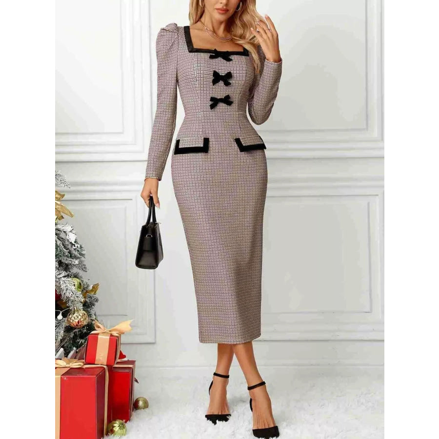 This sophisticated midi dress features a classic houndstooth pattern in neutral tones with elegant black bow accents on the front. The square neckline adds a modern touch while the fitted silhouette creates a flattering hourglass shape. Made from high-quality stretch fabric that provides comfort and durability. The long sleeves and midi length make it perfect for professional settings, business meetings, or formal occasions. Black contrast trim along the neckline and pockets adds visual interest and definition. This versatile piece transitions seamlessly from day to night, making it an essential addition to any wardrobe for the fashion-forward woman who values both style and sophistication.