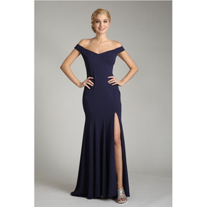 Solid off the shoulder mermaid gown with a slit and pleated skirt.